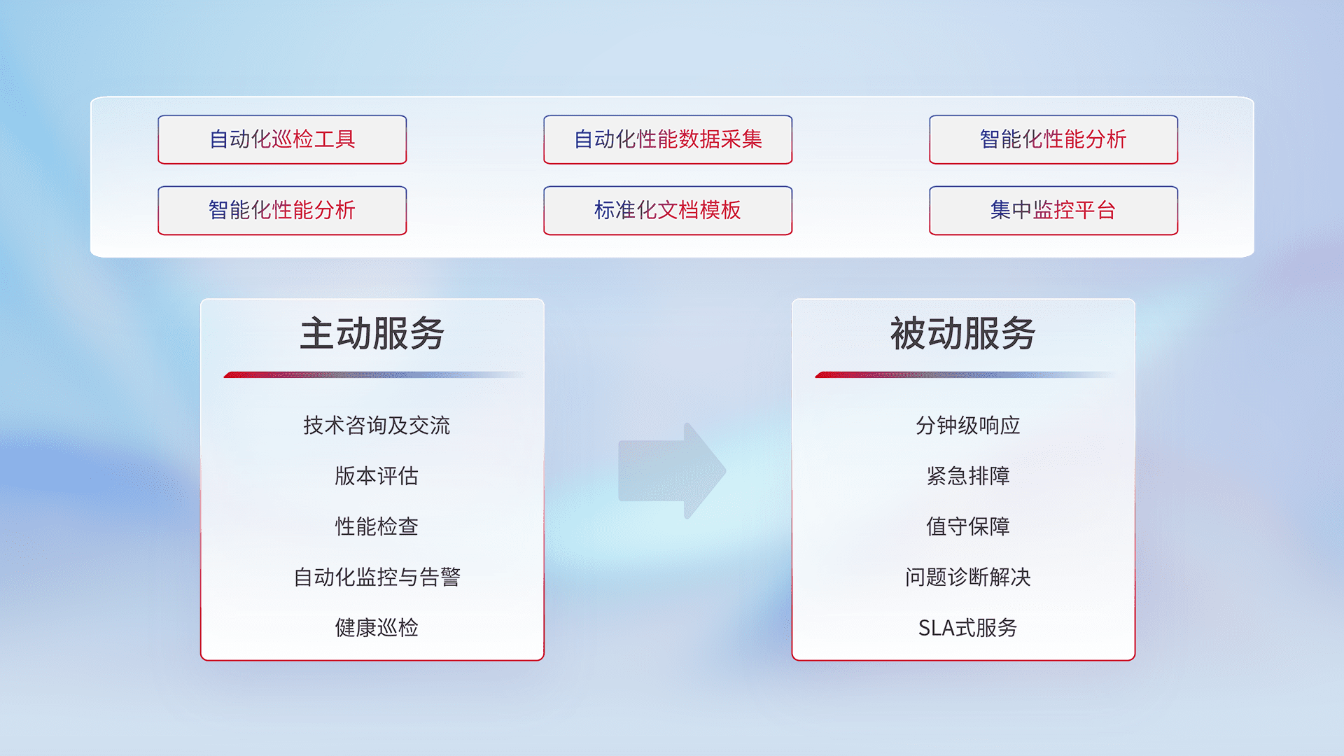智能化工具和标准化文档,,,,保障服务质量,,提供主动服务(包含技术咨询、、、版本评估、、、性能检查、、自动化监控与告警、、健康巡检)和被动服务包含(分钟级响应、、、、紧急排障、、、值守保障、、问题诊断解决、、、、SLA服务)。。